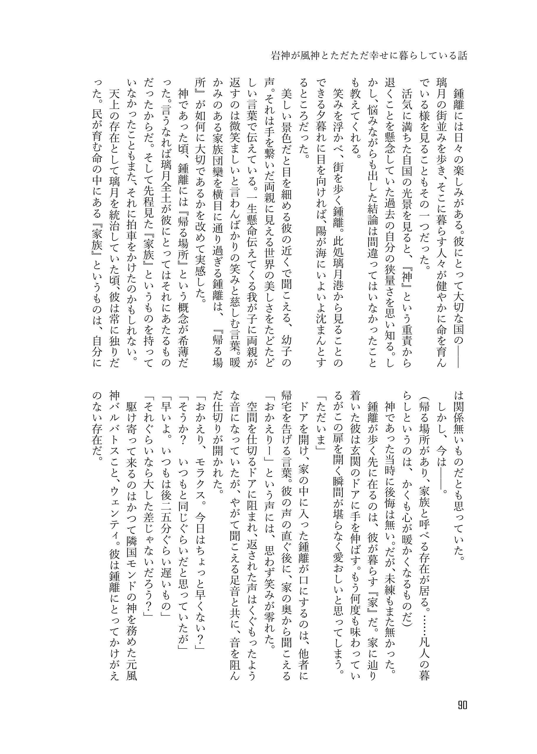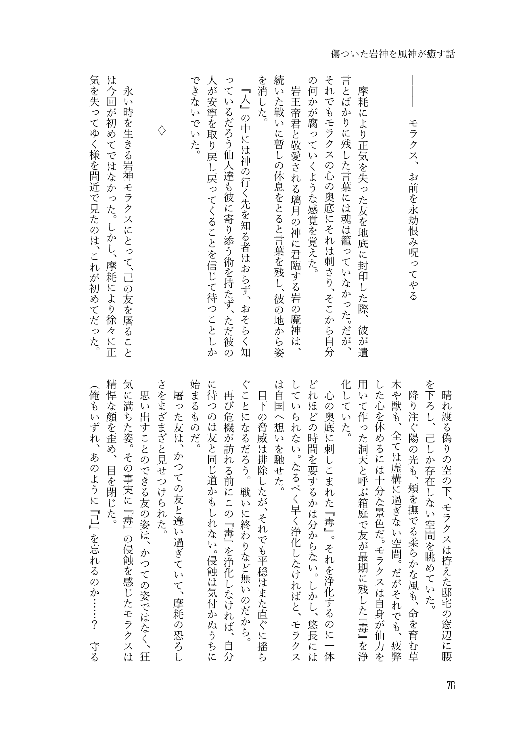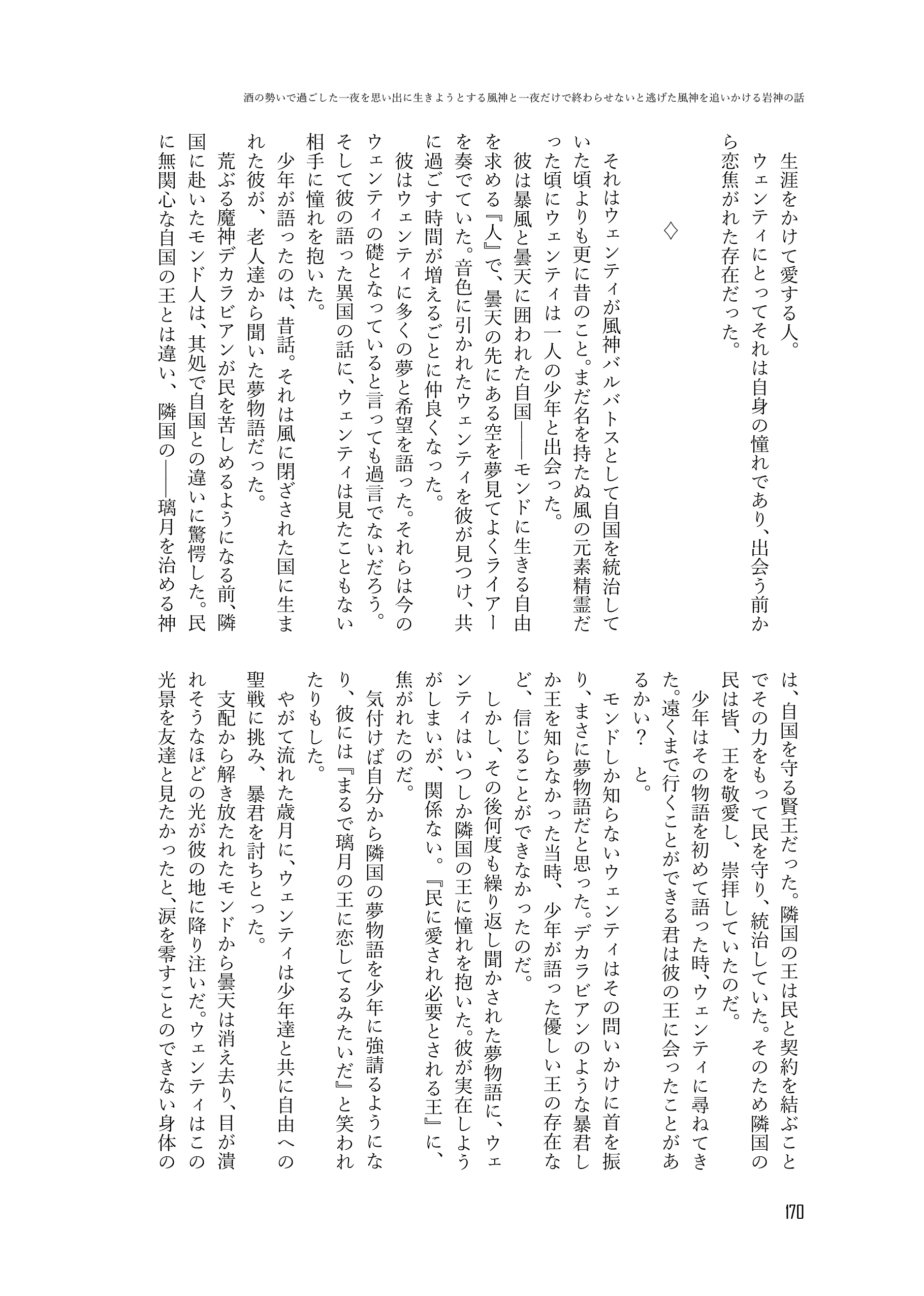 収録内容➡風神がお酒で失敗する話、風神がお酒で失敗する話 間の話、傷ついた岩神を風神が癒す話、岩神が風神とただただ幸せに暮らしてる話、ついてない旅人(♂)の話、自国と隣国の風習の違いに振り回される風神の話、酒の勢いで過ごした一夜を思い出に生きようとする風神と一夜だけで終わらせないと逃げた風神を追いかける岩神の話