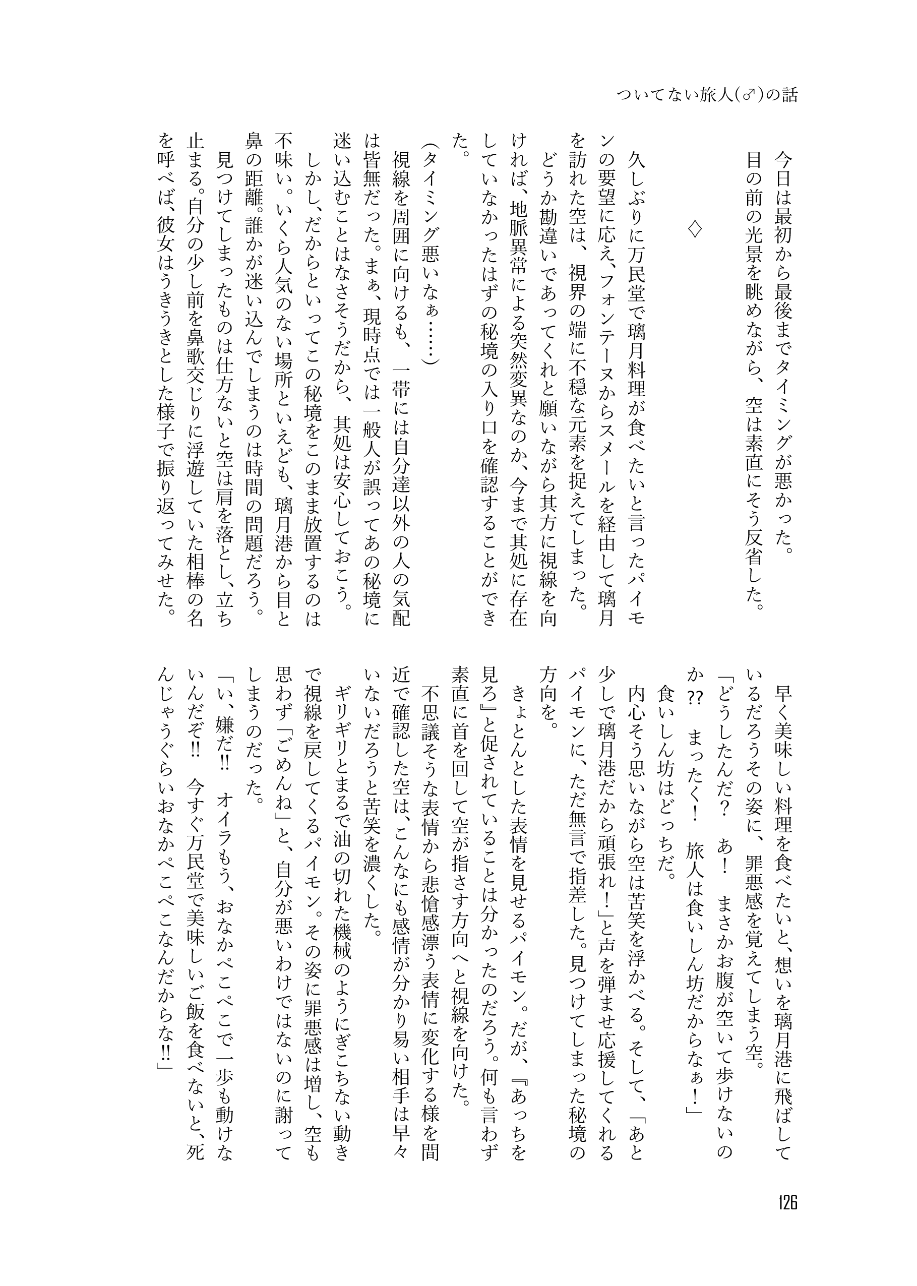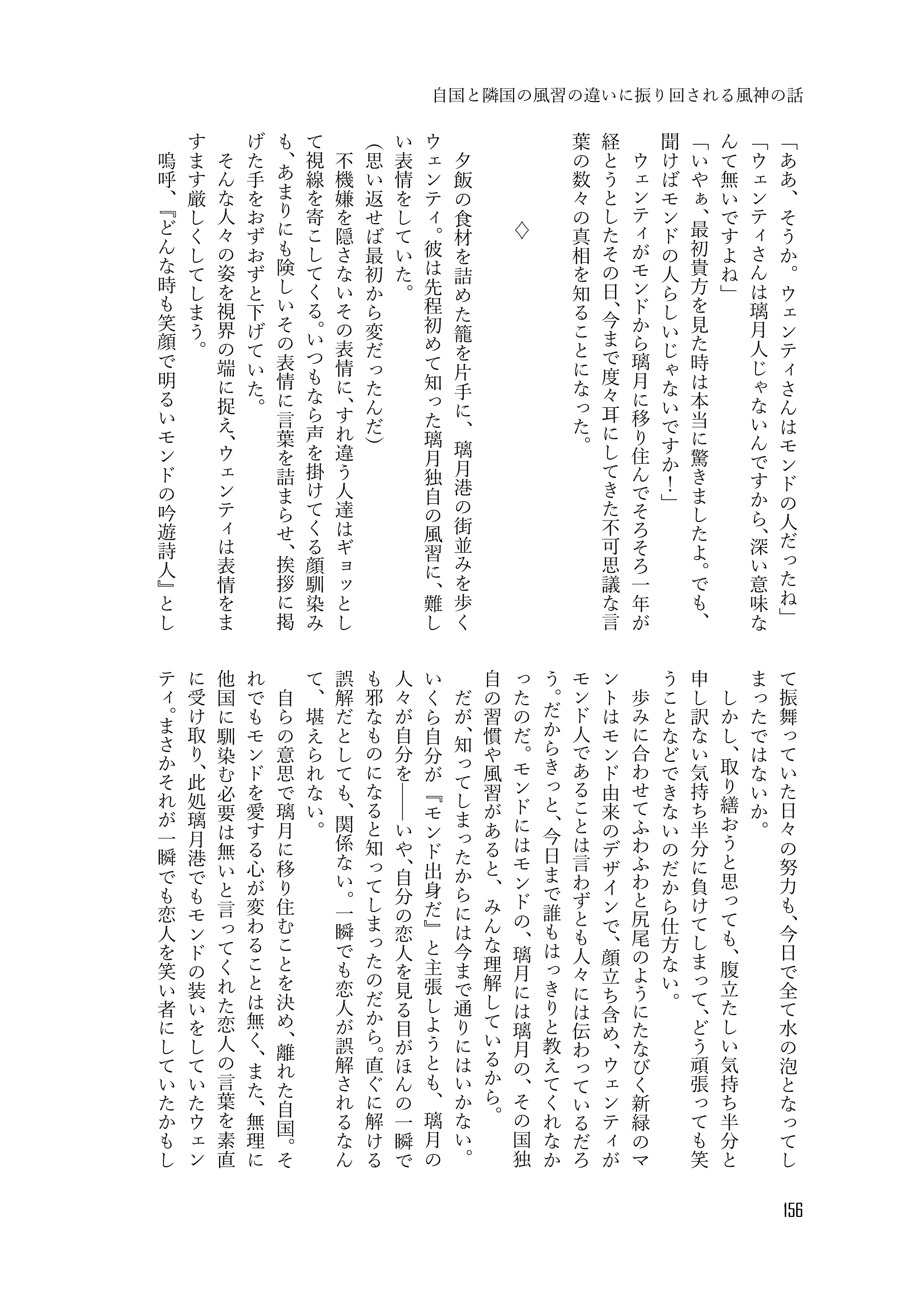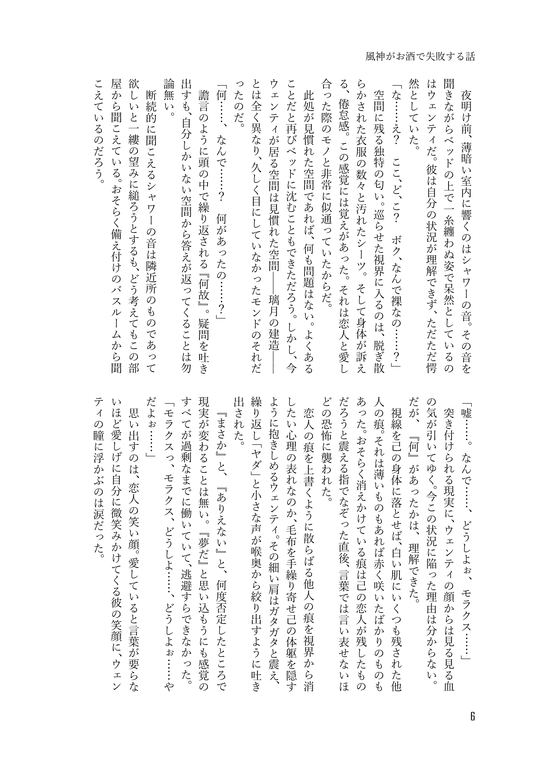 収録内容➡風神がお酒で失敗する話、風神がお酒で失敗する話 間の話、傷ついた岩神を風神が癒す話、岩神が風神とただただ幸せに暮らしてる話、ついてない旅人(♂)の話、自国と隣国の風習の違いに振り回される風神の話、酒の勢いで過ごした一夜を思い出に生きようとする風神と一夜だけで終わらせないと逃げた風神を追いかける岩神の話