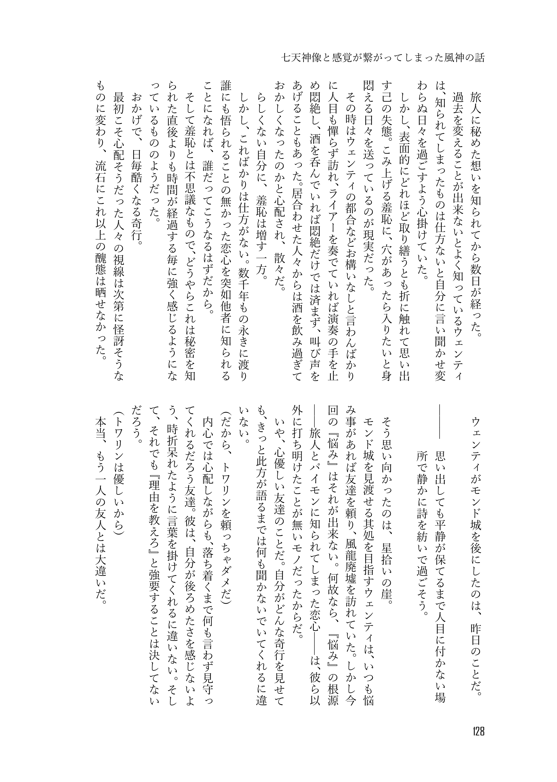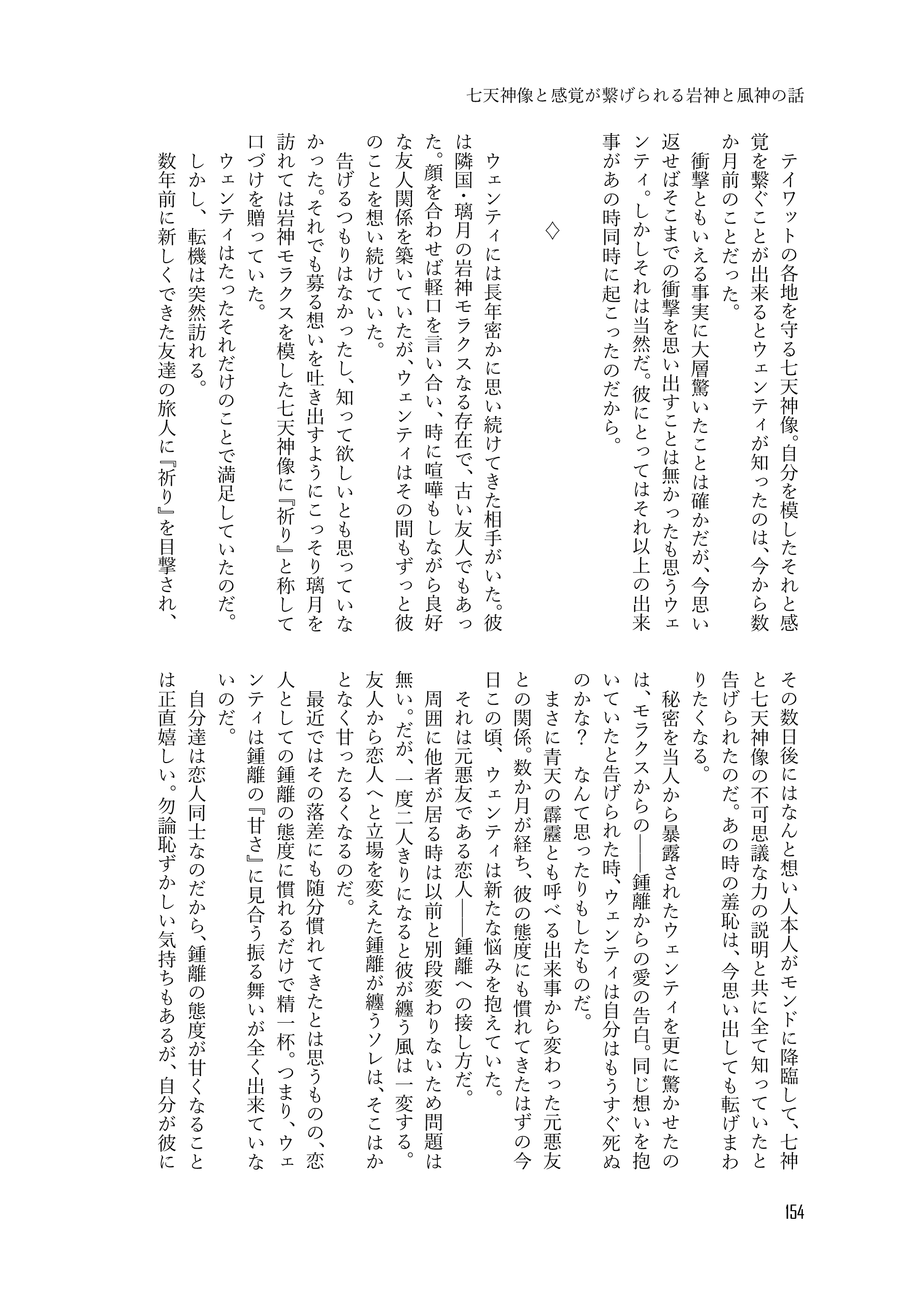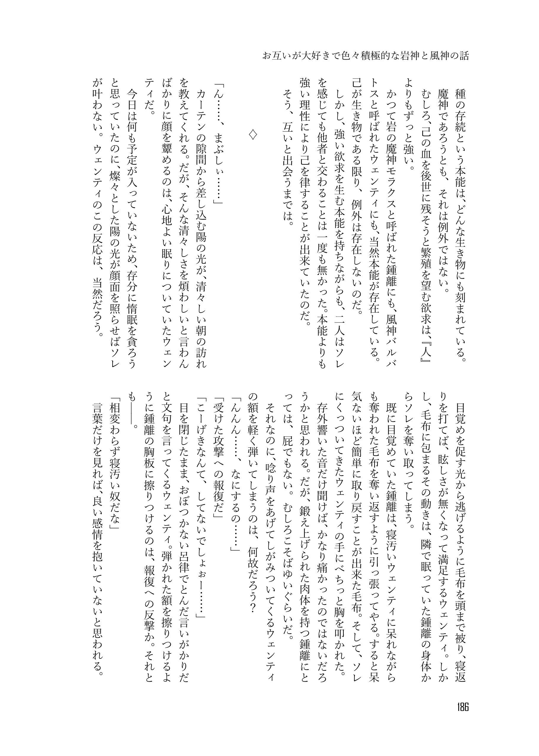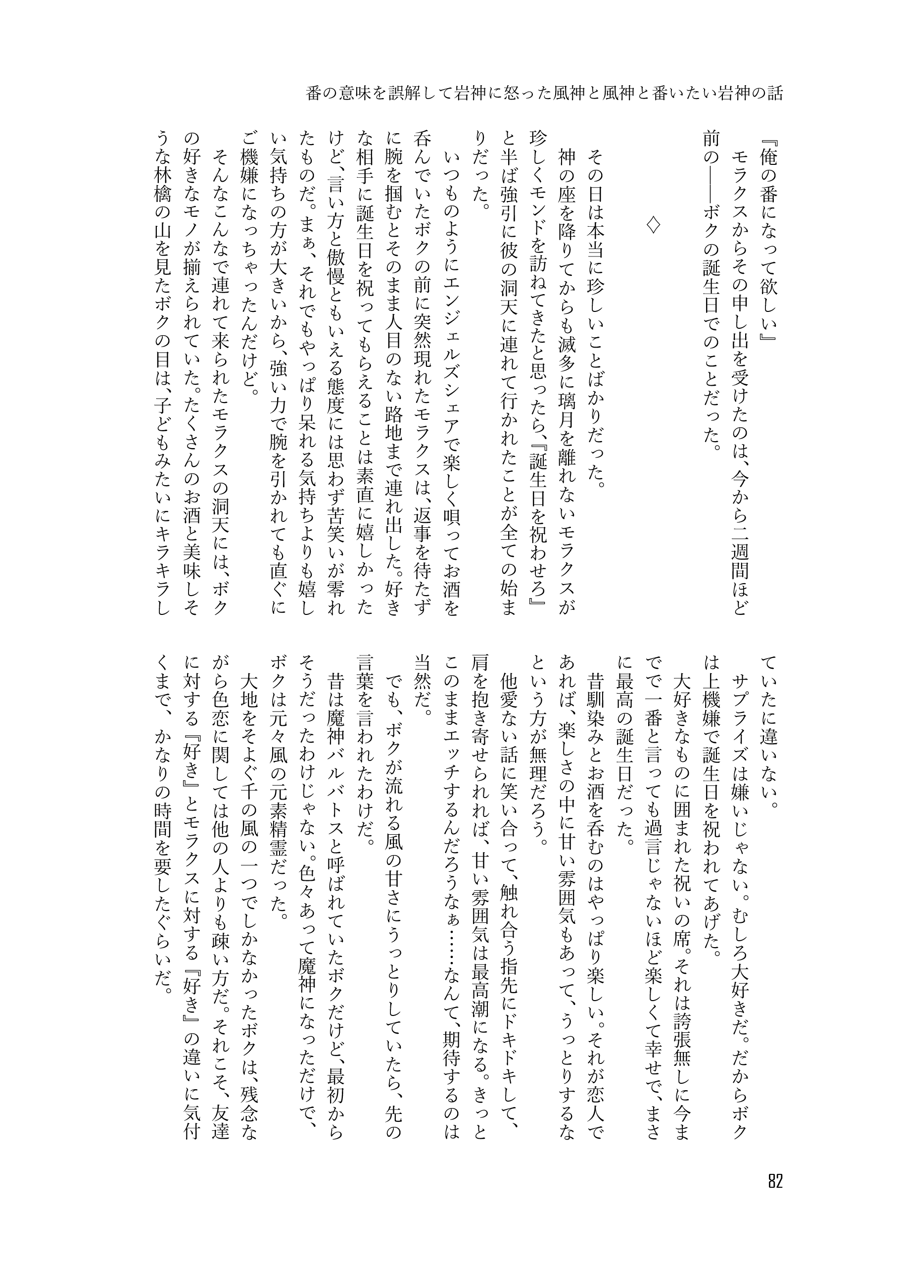 収録内容➡オメガバースな世界で生きる岩神と風神が家族を作るために頑張る話、岩神と風神の初夜の話、番の意味を誤解して岩神に怒った風神と風神と番いたい岩神の話、七天神像と感覚が繋がっている岩神の話、七天神像と感覚が繋がってしまった風神の話、七天神像と感覚が繋げられる岩神と風神の話、お互いが大好きで色々積極的な岩神と風神の話